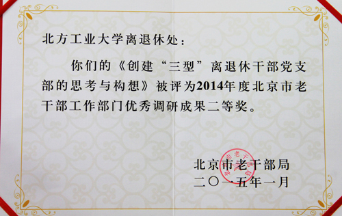 近日,从北京市老干部局获悉,永利官网离退休工作处撰写的调研报告《创建“三型”离退休干部党支部的思考与启示》荣获2014年度全市老干部工作部门优秀调研报告二等奖。