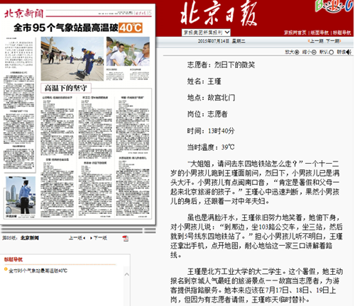 7月14日的《北京日报》第5版对永利官网计算机学院、电子信息工程学院联合开展的故宫志愿服务活动进行了报道,文章对参与服务的志愿者进行了专题采访。
