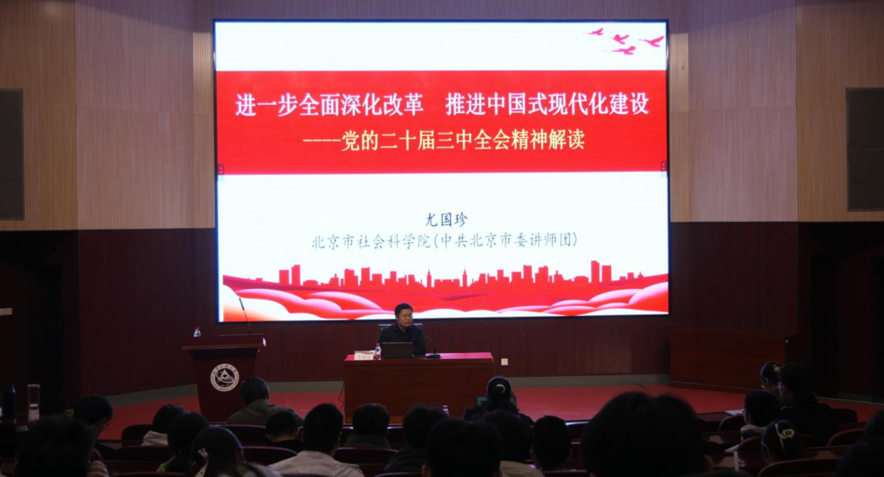 10月29日,“‘京’彩文化青春绽放”信仰行“名师名家进校园”理论宣讲活动在文化会堂举行,特邀北京市社会科学院马克思主义研究所所长、中共北京市委讲师团专家组成员尤国珍教授作专题报告。报告会由马克思主义学院党委书记张茂林主持。尤国珍教授以“进一步全面深化改革推进中国式现代化建设”为主题,从深刻认识党的二十届三中全会召开的时代背景、全面准确理解《中共中央关于进一步全面深化改革、推进中国式现代化的决定》提...