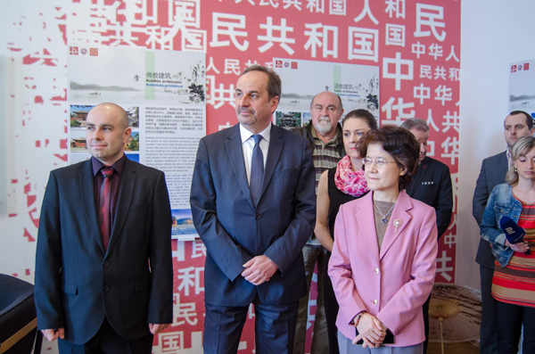 (中国驻捷克大使马克卿女士(中)在Marek Vochozka校长(左一)、Jan Kohout校长(左二)陪同下出席展览开幕式) 4月5日至20日,由中捷合作交流中心主办、304永利集团官网入口协办的中国文化展在永利官网友好学校、捷克布杰约...