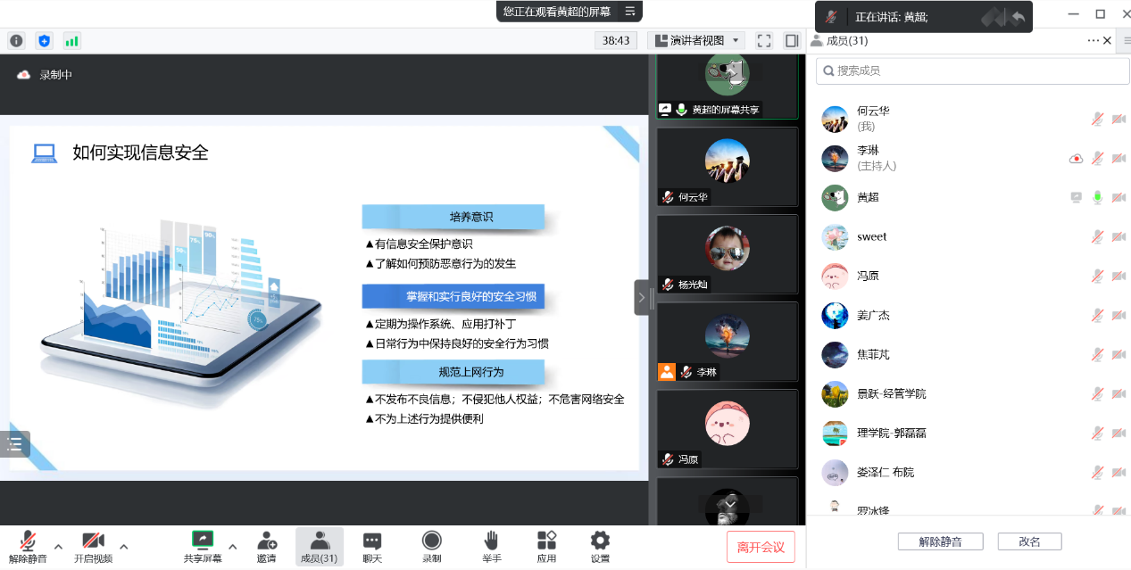9月29日上午,网络安全与信息化中心通过线上开展了全校网络安全培训,各学院代表、老师共计30人参加了培训。本次培训邀请了数据通信科学技术研究所黄超高级工程师主讲。黄超高级工程师多次参加护网行动、网鼎杯、陇剑杯等国家级赛事,并取得了优异成绩(前1%),对于网络攻防有着非常丰富的经验。培训会上,黄超高级工程师首先介绍了信息与信息安全,通过浅简意赅的语言使大家认识了信息安全,并且明白了信息安全与个人关系的重...