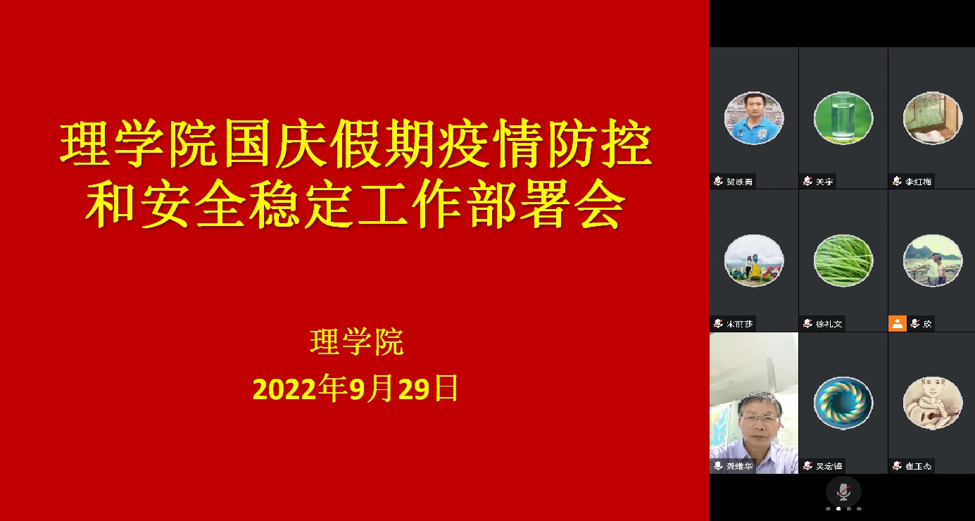 为落实学校关于国庆假期安全稳定工作的会议精神,9月29日晚,理学院线上召开国庆假期安全稳定和疫情防控工作部署会。学院党委委员、班子成员、系主任、责任教授、支部书记、班导师、辅导员、办公室全体老师参加会议。会议由学院党委书记龚维华主持。会上,龚维华传达了上级和学校关于国庆假期疫情防控和安全稳定工作的最新精神,并就学院国庆期间重点工作做了具体部署。一是严格落实北京市和学校疫情防控政策,进一步落实常态化...