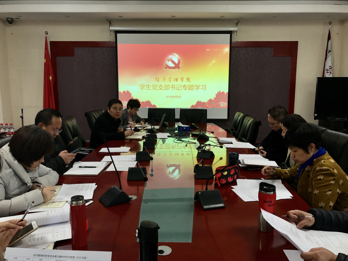 2019年4月9日下午,经济管理学院在励学楼201会议室开展学生党支部书记专题学习,学院党委书记王伟宾、党委副书记赵洁以及各个学生党支部书记参加了本次专题学习,本次会议由王伟宾书记主持召开。首先,学院党委副书记赵洁就工作的规范性和支部重点工作向大家进行了通报,梳理了工作的关键时间节点及应注意的问题。她强调,要加强党建与学风建设相结合,根据支部特色类型,突出重点工作。要充分加强学院各系支部间的合作交流,发...
