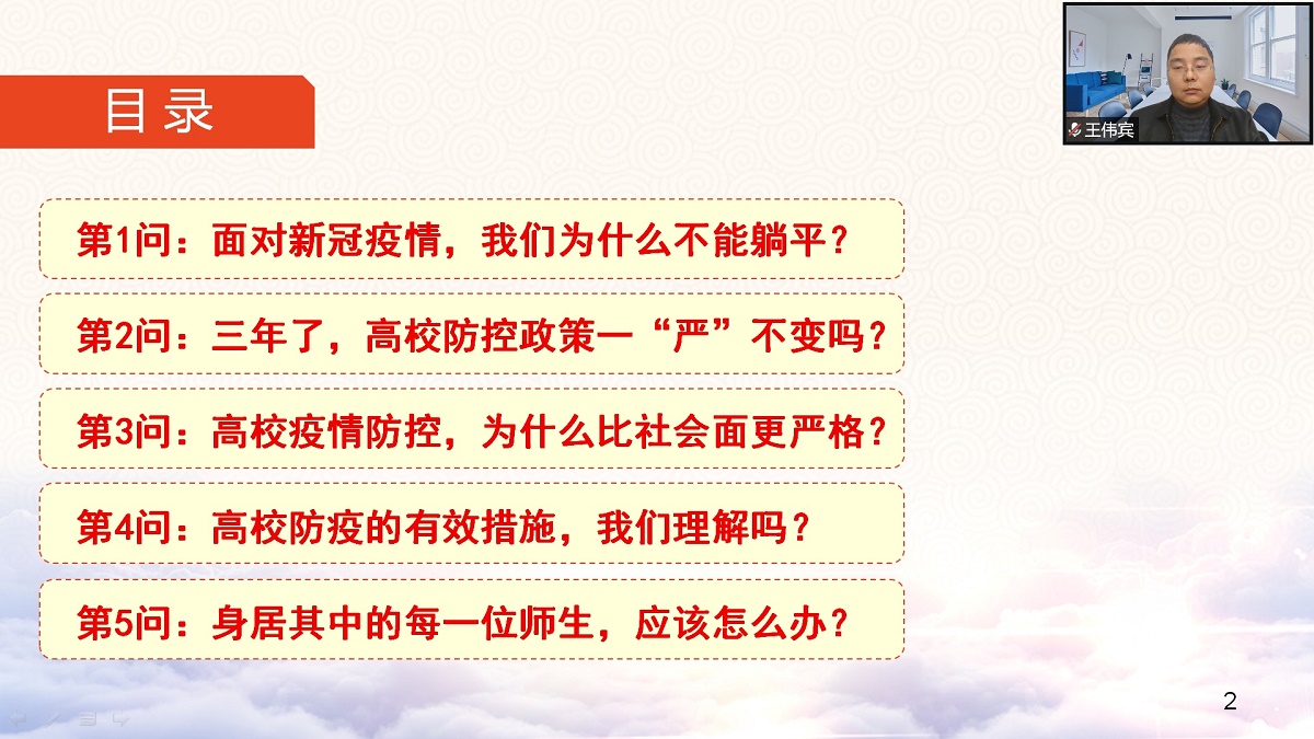 为进一步落实主体责任,加强风险管理,守护校园安全,11月30日,经济管理学院党委书记王伟宾通过线上的方式对班子成员、系主任、支部书记开展了“高校疫情防控之五问五答”专题大思政课。王伟宾围绕“面对新冠疫情,我们为什么不能躺平?”“快三年了,高校防控政策一‘严’不变吗?”“高校疫情防控,为什么比社会面更严格?”“高校防疫措施,真的有效吗?”“身居其中的每一位师生,应该怎么办?”等五个大家关于当前疫情防...