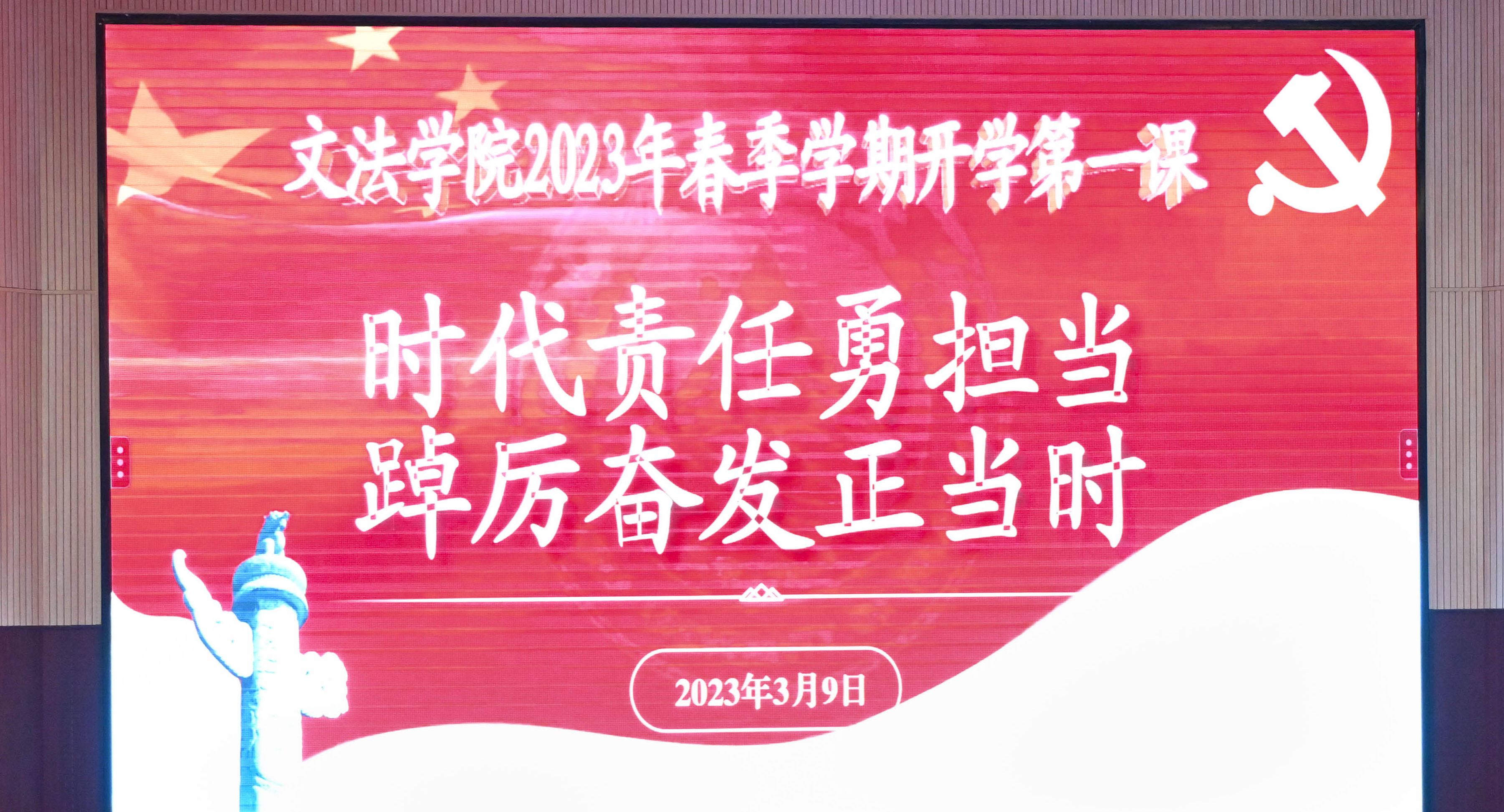 春回大地,万物欣荣。为深入学习宣传贯彻习近平新时代中国特色社会主义思想和党的二十大精神,引导广大青年明确努力方向和奋斗目标,激励青年学生奋发向上、立志成才,3月9日,文法学院党委书记袁凤识以“时代责任勇担当踔厉奋发正当时”为题,为文法学院青年学生讲授2023年春季学期开学第一课。学院党委副书记刘霁炜、全体辅导员及百余名学生参加。袁凤识结合个人成长和工作经历,从“伟大成就再回顾”“时代责任勇担当”“校...