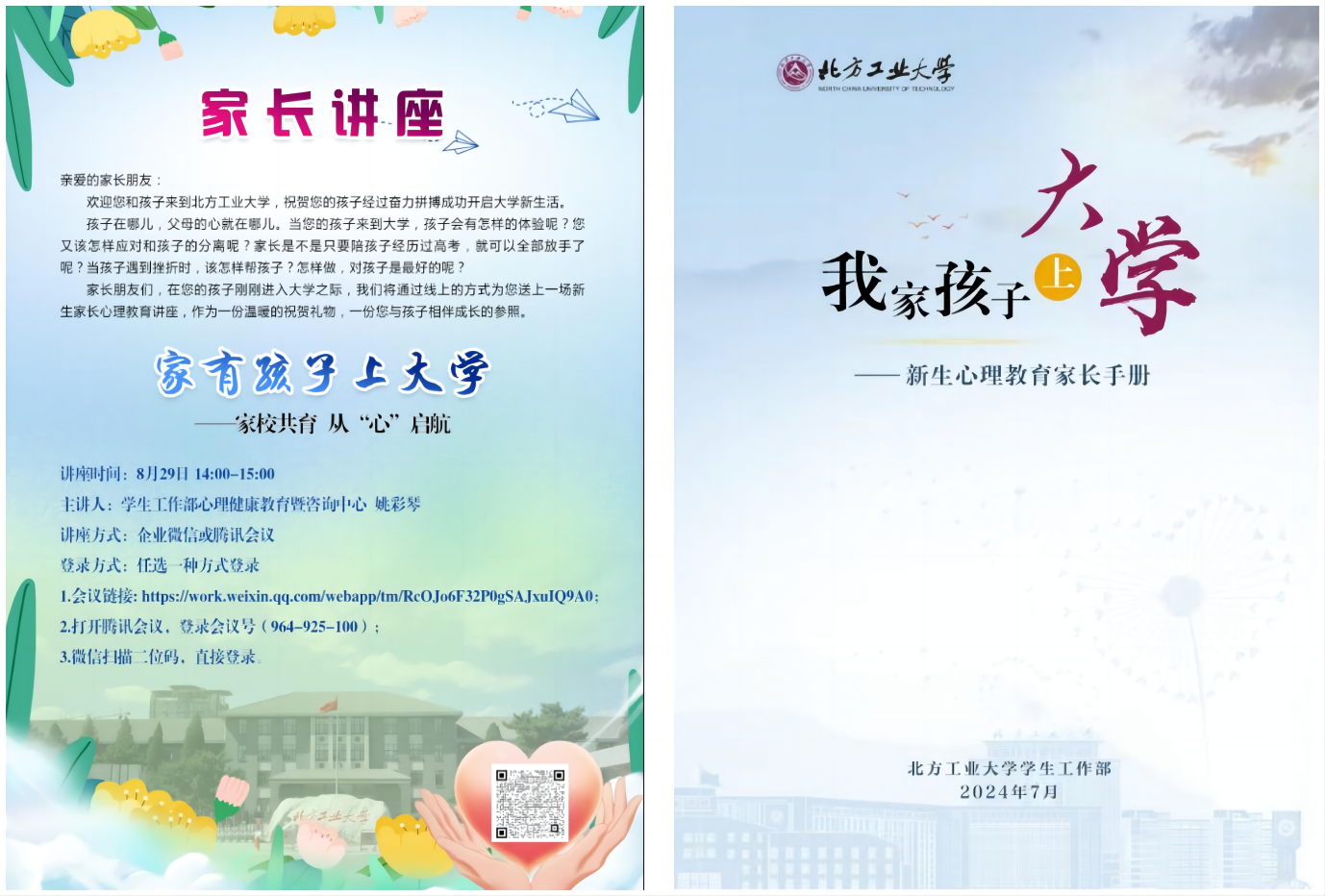 在8月29日新生报到之际,学工部心理中心通过线上、线下方式举办了多场次新生家长心理课堂。课堂以“家校共育,从‘心’启航”为主题,结合丰富的新生心理案例,探讨大学新生在适应阶段常见心理问题和可能出现的心理挑战,提出父母支持孩子的有效方法,倡导家长以理解、接纳、倾听、沟通、鼓励及适度引导的方式,与孩子携手同行。同时,强调父母在子女成长关键期应注重自我关爱,以积极心态调整自我,成为孩子的榜样、伙伴与坚强...