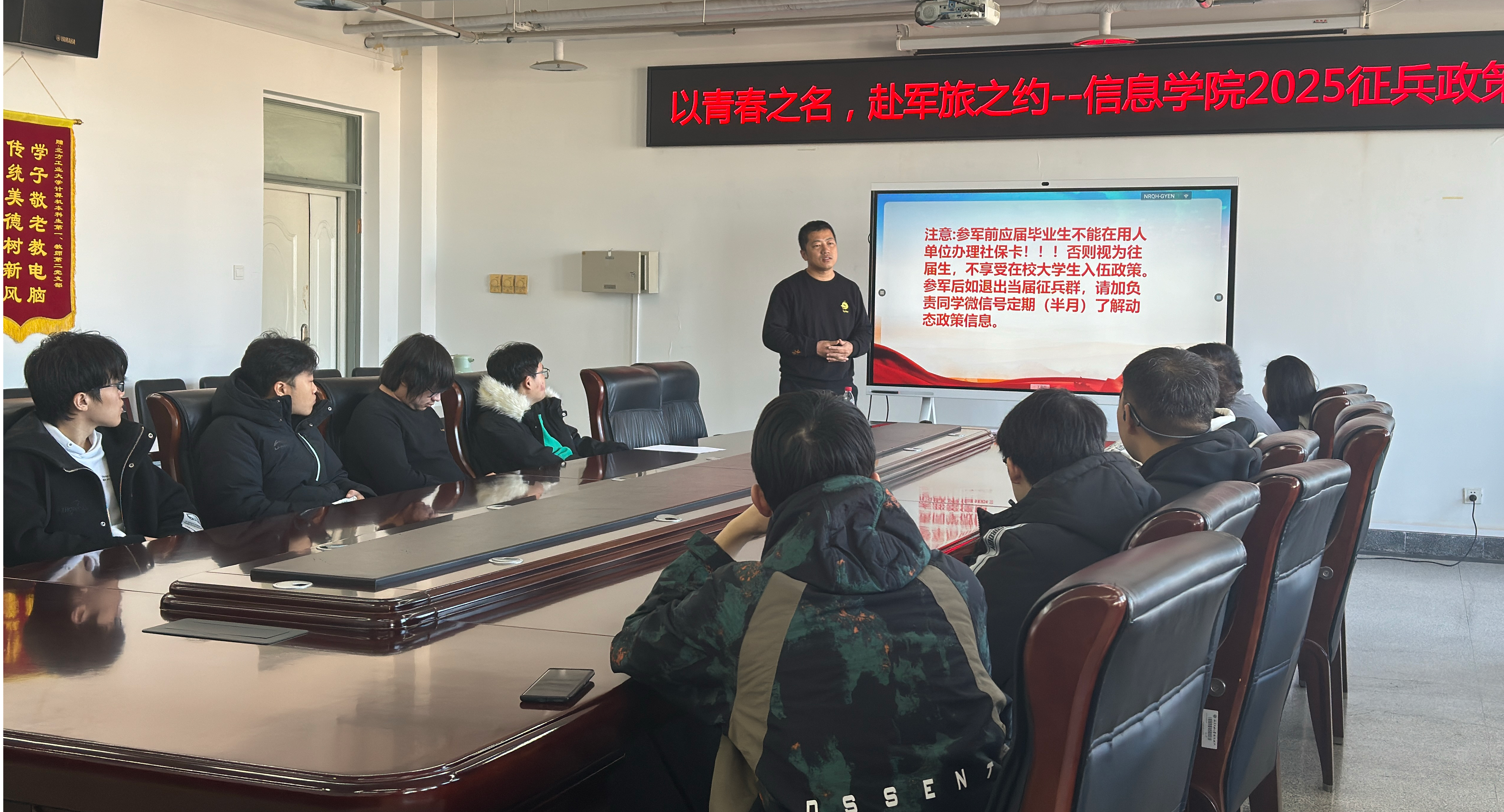 为切实做好2025届毕业生就业指导服务工作,帮助毕业生了解当前就业形势和政策,鼓励毕业生投身国防事业,拓宽2025届毕业生就业渠道。2024年12月17日,信息学院在瀚学楼1014组织开展2025届毕业生的征兵政策宣讲会,本次政策宣讲会由武装部苏宁老师主讲,2025届毕业生辅导员魏静、田庆玥以及2025届征兵意向毕业生代表参加。苏宁详细介绍征兵流程、报名条件、体检标准等方面政策,重点介绍了大学生参军入伍优抚待遇,对应征报名、...