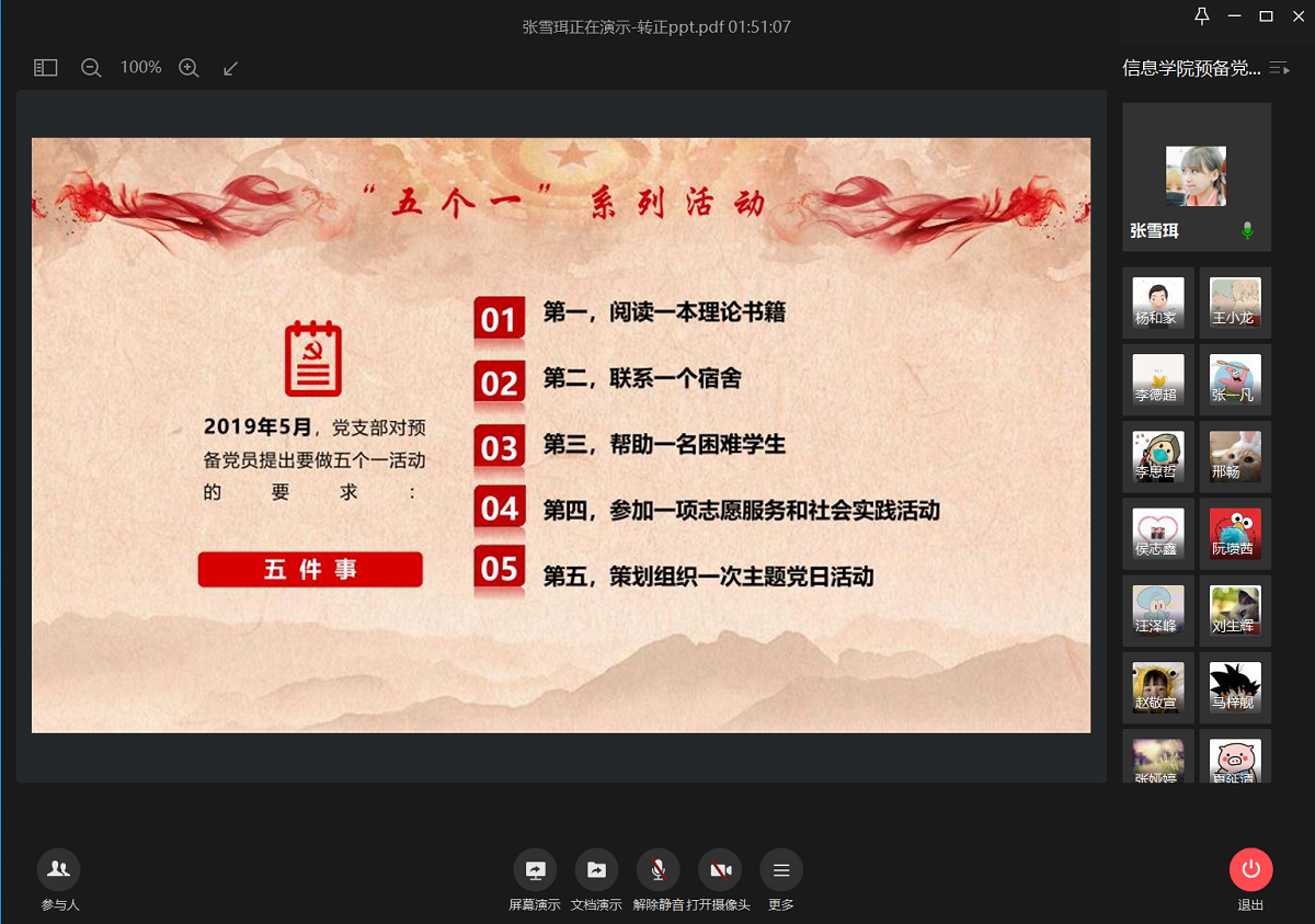 为加强对预备党员的教育和管理,综合考察预备党员一年预备期期间先锋模范作用的发挥,信息学院党委于5月21日和22日下午在企业微信召开了两场“预备党员履职尽责情况汇报会”。学院党委委员、支部书记、学生党建中心成员对63名预备党员在预备党员期内的履职尽责情况进行了考核评价。会议由学院学生党建中心副主任杨和家主持。 党委书记刘文楷在听取了汇报后指出,通过此次汇报,学院党委看到了预备党员在预备期的成长,虽处疫...
