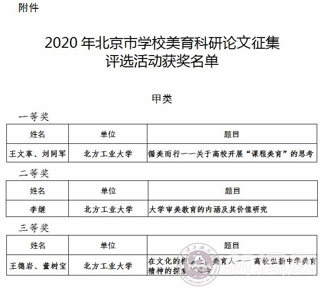 日前,北京市教育委员会举办的2020年北京市学校美育科研论文征集评选活动结果公布,永利官网文法学院“大学美育”教学团队获得佳绩,报送的3篇论文全部获奖。
