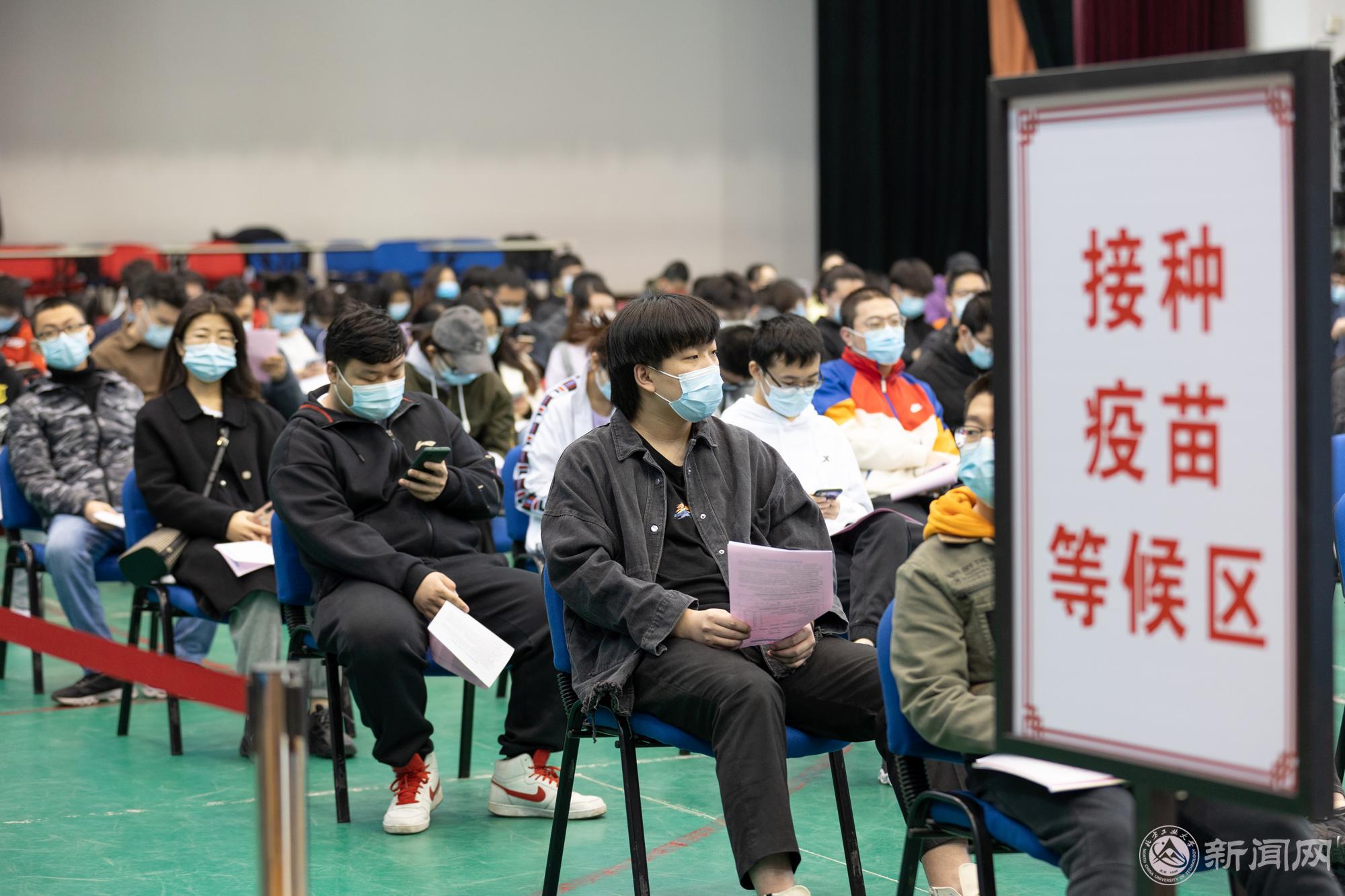 3月24日起,各学院组织在校学生分批开始大规模的接种。同学们按照一米线距离有序排队,随着地标和指引牌自广学桥进入体育馆二层,在入口扫码签到,经健康筛查和体温检测后进入登记区。
