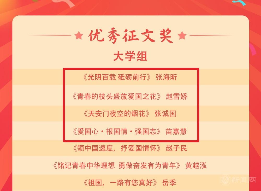据悉,本次主题征文活动由“学习强国”北京学习平台面向首都广大青少年开展,旨在深入贯彻落实习近平新时代中国特色社会主义思想,特别是习近平总书记关于加强爱国主义教育、促进青少年成长等一系列重要论述,进一步引导广大青少年涵养家国情怀,坚定民族自信,积极培育社会主义核心价值观,让爱国主义精神在青少年心中牢牢扎根。本次征文活动共征集到作品2522多篇,经组委会专家评审组评审,大学组共评选出70篇优秀征文作品,其中精品征文作品9件,优秀作品61件。