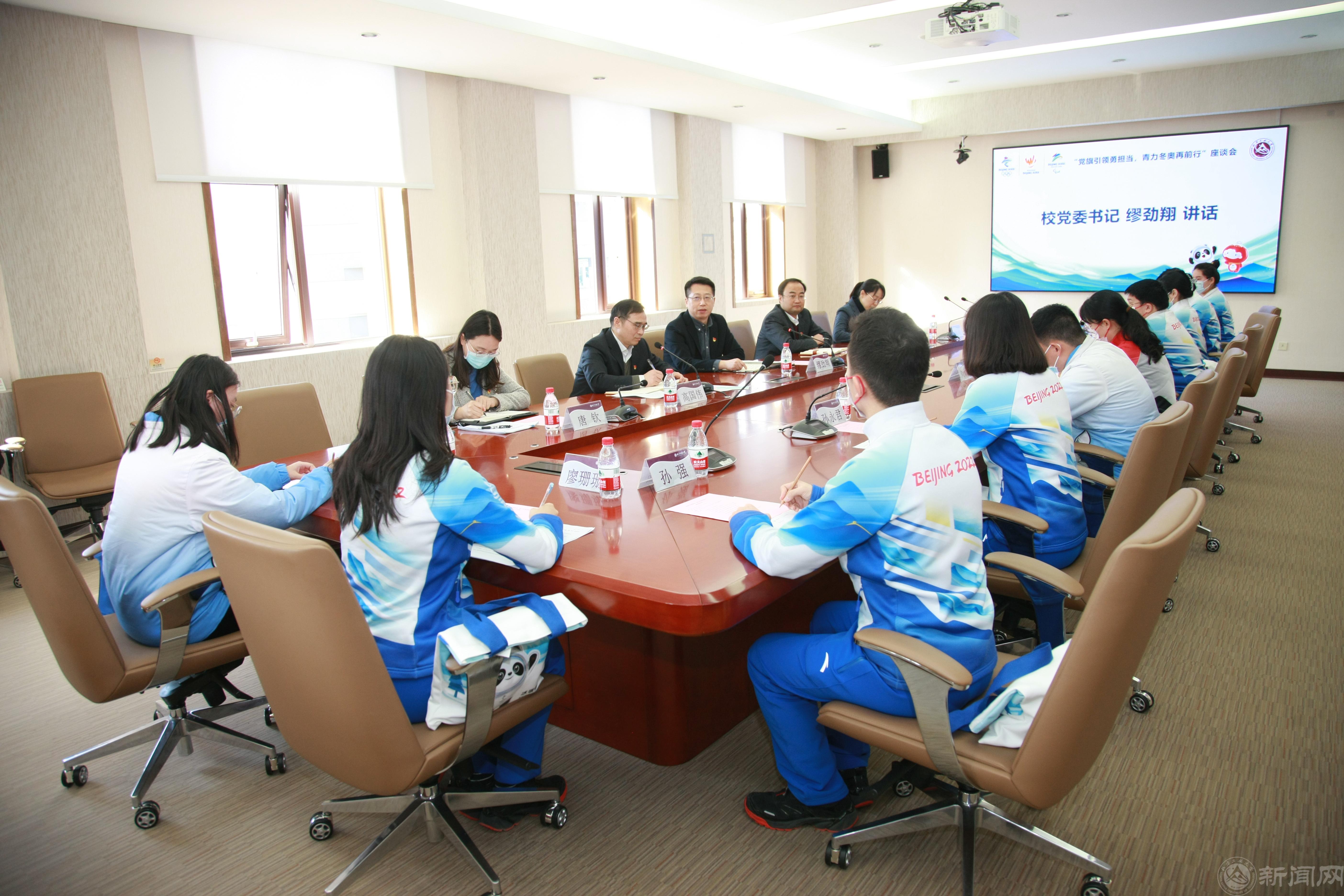 校团委书记杨超汇报了学校冬奥和冬残奥阶段志愿服务工作开展情况。校学工部、校团委负责人,各学院团委书记参加了座谈会。