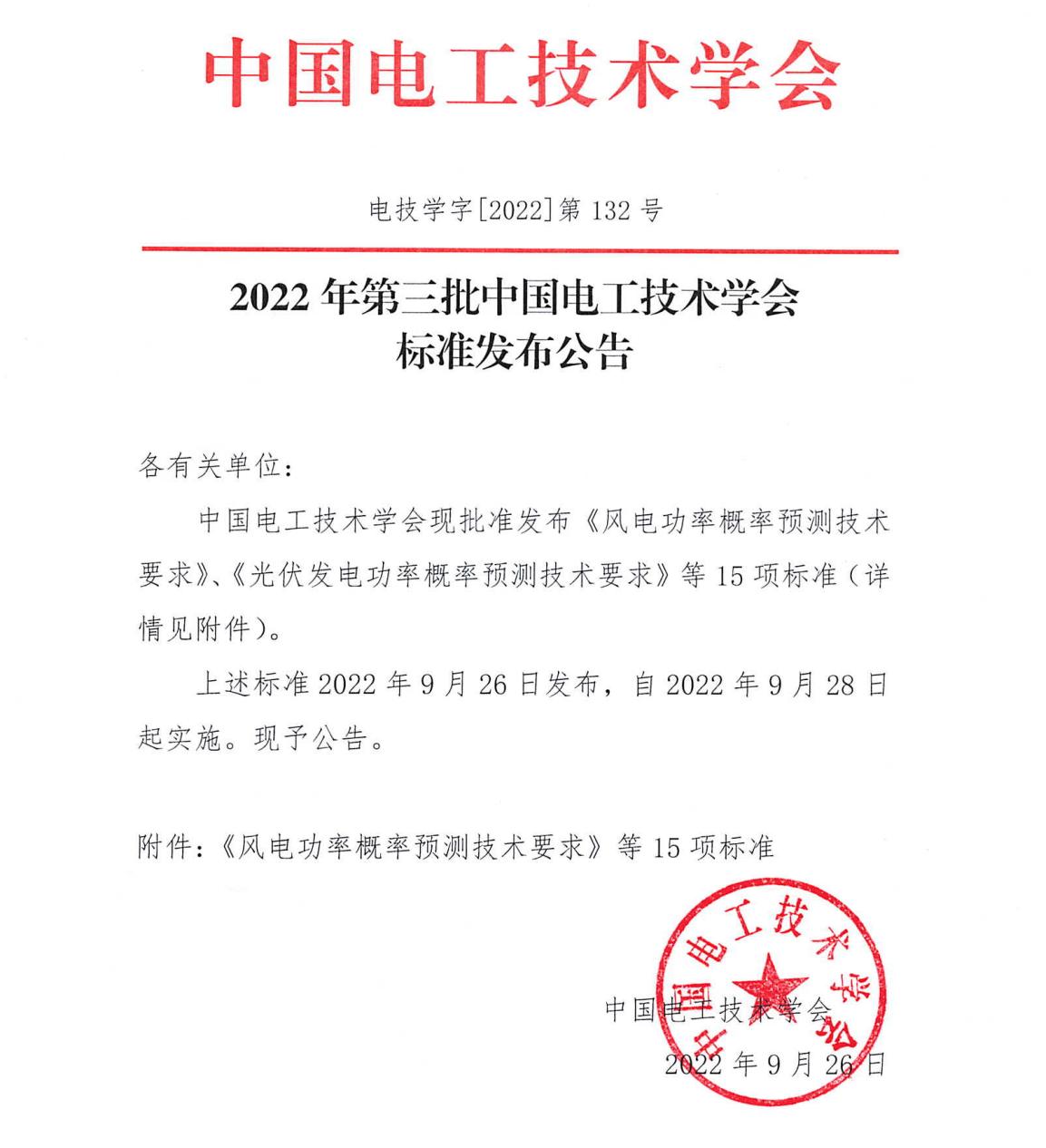 9月26日,中国电工技术学会储能领域第三批标准正式发布,自2022年9月28日起实施。此次共公布15项技术标准,其中永利官网牵头起草1项,参与起草4项,为标准的制定作出重要贡献。