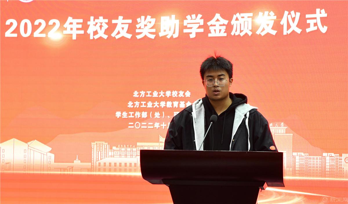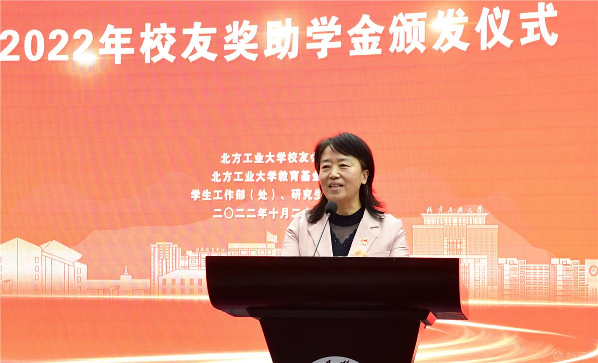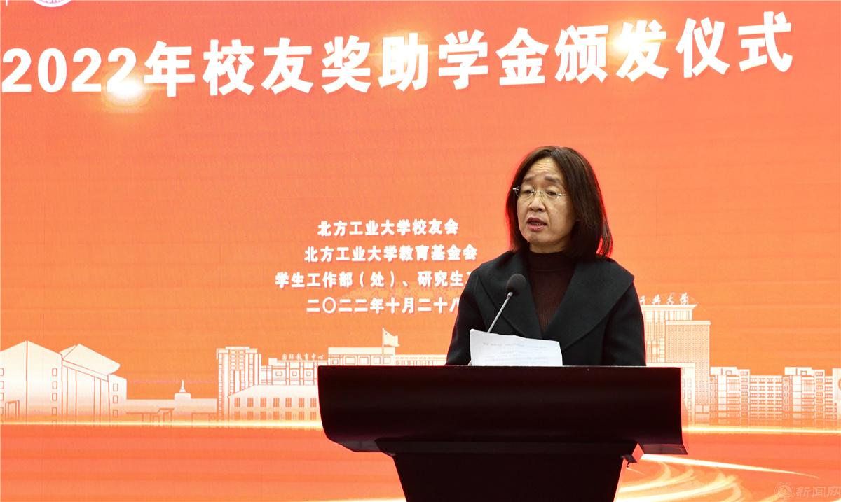 田红芳向捐资助学的校友们表示感谢,向获奖师生表示祝贺。她表示,自校友会成立以来,广大校友心系母校,反哺助力母校事业发展,学校会铭记校友们的善举,也希望越来越多的北方工大人传承和弘扬这种大爱。她要求,广大师生要认真学习宣传贯彻党的二十大精神,充分领悟习近平总书记“教育、科技、人才是全面建设社会主义现代化国家的基础性、战略性支撑”等重要论述的科学内涵,为加快建设教育强国、科技强国、人才强国,实现中华民族伟大复兴做出北方工大人应有的贡献。她希望,广大教师要继续发扬业精善学、敬业爱生、修身立德的优良传统,以德立身、以德立学、以德施教,严爱相济、润己泽人,争当新时代的优秀引路人、大先生,培养更多堪当民族复兴大任的社会主义建设者和接班人;希望同学们不负时代、不负韶华,坚定不移听党话、跟党走,怀抱梦想又脚踏实地,敢想敢为又善作善成,立志做有理想、敢担当、能吃苦、肯奋斗的新时代好青年,让青春在全面建设社会主义现代化国家的火热实践中绽放绚丽之花。