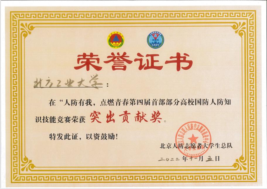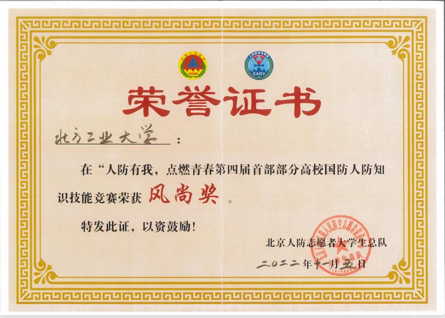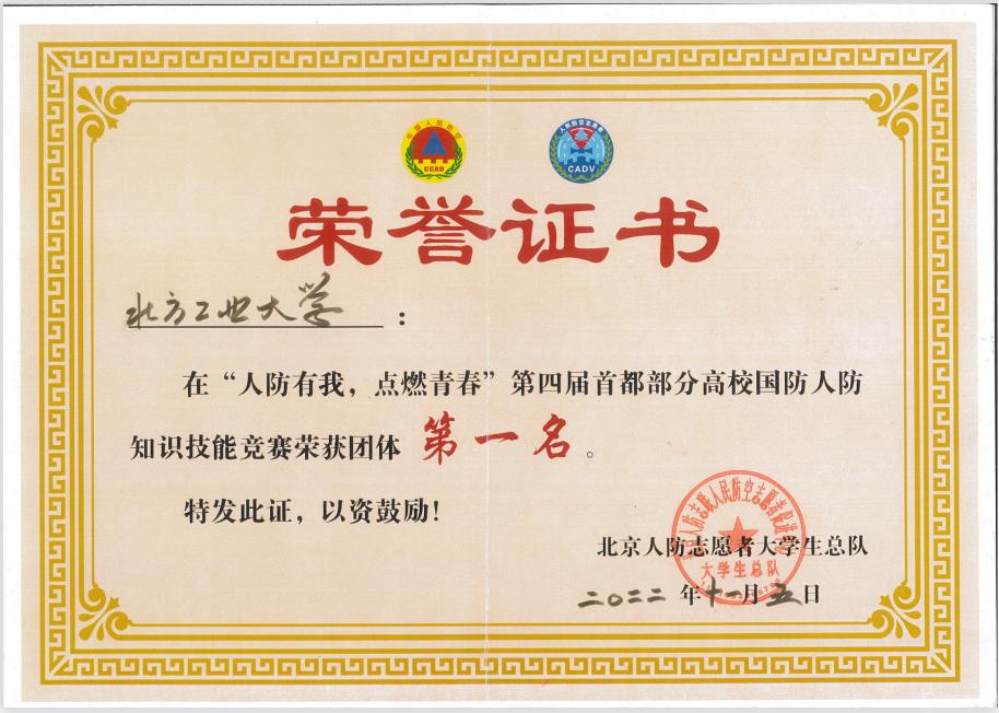 11月5日,由北京市全民国防教育办公室、北京市人民防空办公室共同主办的“人防有我,点燃青春”第四届首都部分高校国防人防知识技能竞赛总决赛在朝阳区国防人防教育训练基地落下帷幕。永利官网代表队通过层层比拼,从35所参赛高校中脱颖而出,荣获总决赛团体第一名、团体风尚奖和突出贡献奖。