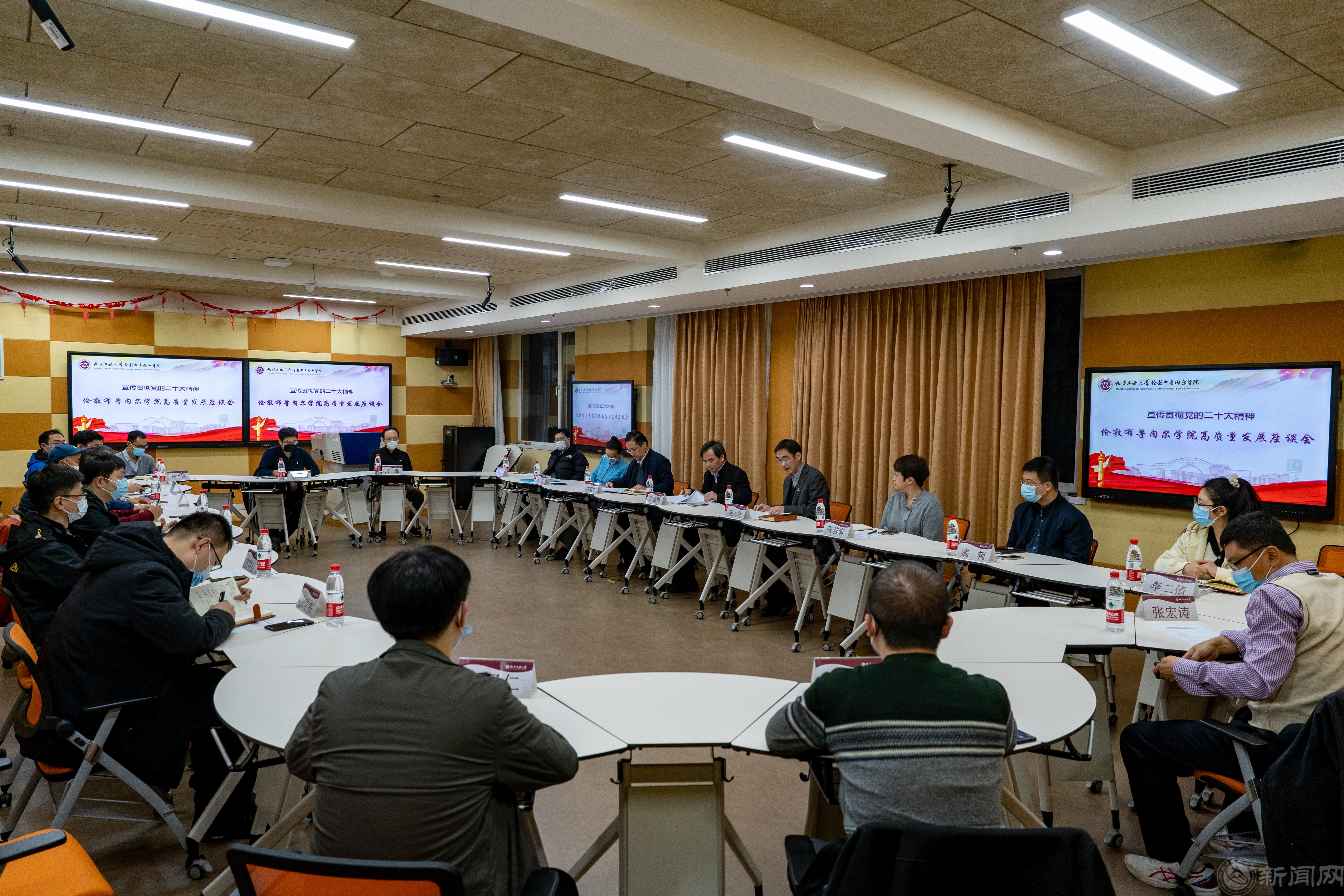王建稳在座谈会上指出,党的二十大报告首次把教育、科技、人才进行“三位一体”统筹安排、一体部署,共同服务于创新型国家建设和高质量发展,具有战略意义和深远影响。要把学习贯彻党的二十大精神和学校“十四五”规划中确定的“打造中外合作办学标杆”重要任务有机结合起来,着力提升中外合作办学水平,办好伦敦布鲁内尔学院,加快推进国际化的高水平应用型大学建设,服务好首都国际交往中心功能建设。他强调,结合近三年来中外合作办学各专业的招生录取情况、专业培养方案执行情况和首届学生发展跟踪情况来看,中外合作办学高质量发展的任务非常繁重,面临很大的挑战和不确定性,需要进一步和英方沟通完善培养方案,推进课程内容衔接,加强学风建设和招生宣传工作,围绕迎接教育部中外合作办学评估扎实细致推进各项工作。