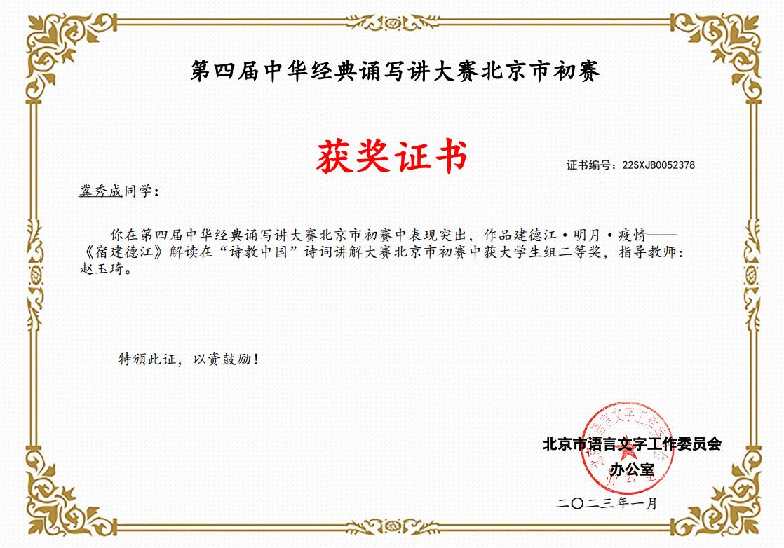 学校对比赛进行了精心组织,于2022年6月在全校开展了“传承红色文化 喜迎党的二十大”中华经典诵写讲比赛作品征集活动,共收到84项作品,评选出校级优秀作品28项,并推荐参与全市评选。经过北京市语委专家组评选,文法学院冀秀成同学作品《建德江·明月·疫情》获“诗教中国”诗词讲解大赛二等奖,文法学院郭京宁同学作品《青春中国》、马克思主义学院张淞博等同学作品《盛世中国 百年颂歌》、服务中心作品《读中国》获“诵读中国”经典诵读大赛“优秀奖”,永利官网还获得“诵读中国”经典诵读大赛北京市初赛优秀组织奖和“笔墨中国”汉字书写大赛北京市初赛优秀组织奖。