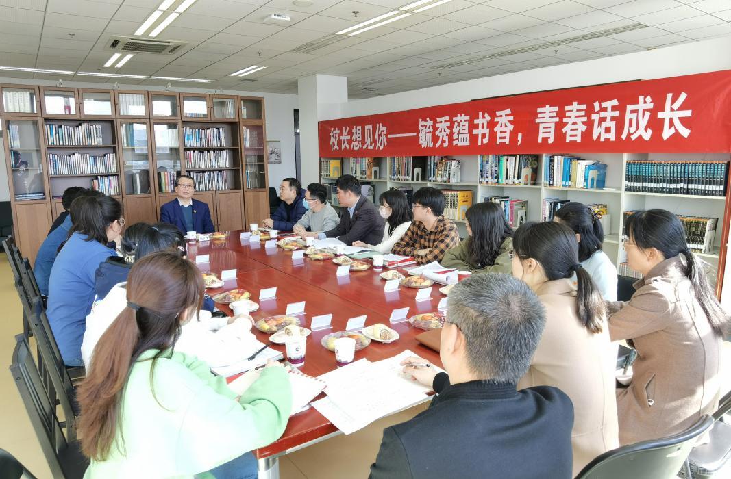 书香校园,经典相伴。3月15日,在全校师生深入学习宣传贯彻党的二十大精神和全国两会精神之际,新学期首场 “校长想见你”励学茶座如期举办,校党委副书记、校长张立峰以“毓秀蕴书华,青春话成长”为题,与来自文法学院的12名青年学子在图书馆特藏室面对面亲切交流。文法学院班子成员、校图书馆负责人参加座谈,座谈会由校团委书记杨超主持。