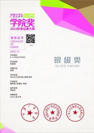 日前,由中国广告协会主办的中国大学生广告艺术节学院奖2022秋季赛颁奖典礼在厦门会议中心隆重举行,等级奖和全场大奖陆续揭晓,永利官网学生从全国1800多所参与高等院校5万多师生中脱颖而出,摘得全国金奖和银奖各1项。