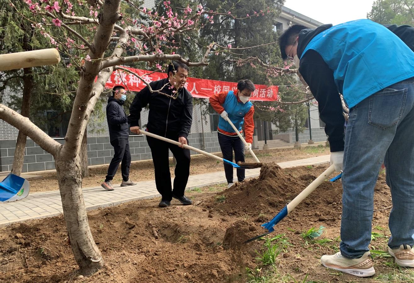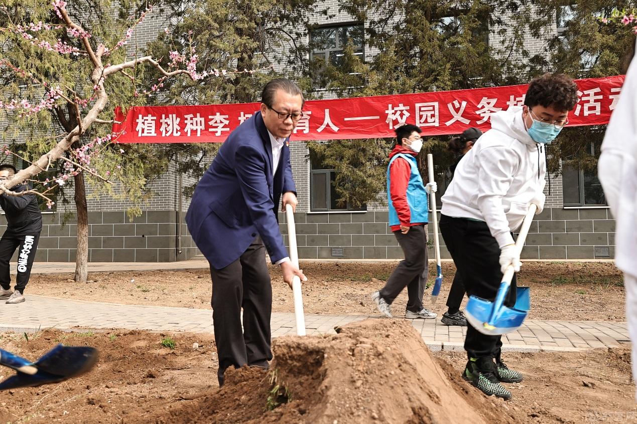 一年之计,莫如树谷;十年之计,莫如树木。4月11日,“植桃种李,树木育人”校园义务植树活动在博智楼南侧开展。校长张立峰、党委副书记史贞军、党委常委副校长王建稳、校长助理陈群与20名同学一起种下了一排桃树。