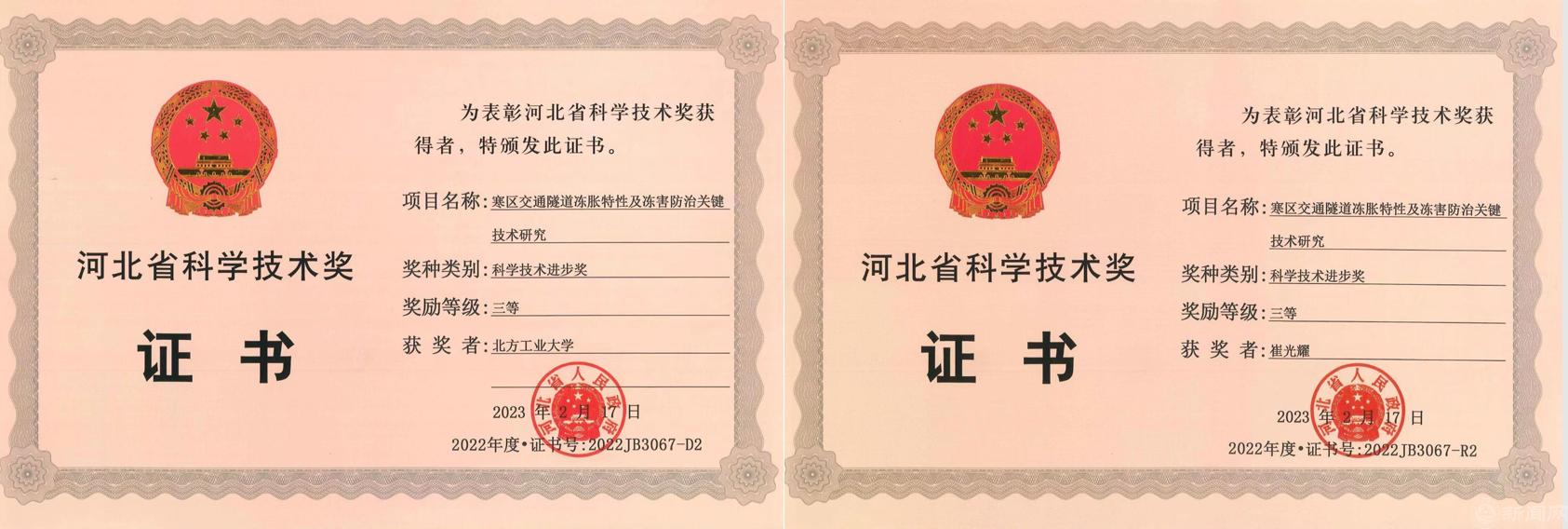 4月6日,河北省政府召开2022年度河北省科学技术奖励大会,对促进科学技术进步和经济社会发展作出突出贡献的单位和个人颁奖。永利官网申报的“寒区交通隧道冻胀特性及冻害防治关键技术研究”和“基于智能无感睡眠监测平台的缺血性脑卒中风险预警关键技术”获得三等奖。