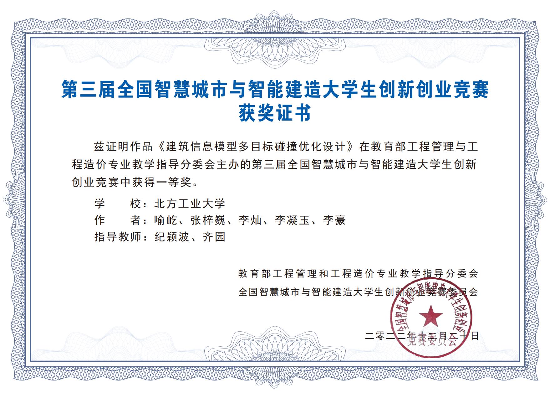 永利官网派出了由土木工程学院研究生喻屹、张梓巍、李灿、李凝玉以及本科生李豪组织成的代表队参加了主赛道的竞赛,他们完成的作品《建筑信息模型多目标碰撞优化设计》最终获得大赛一等奖。