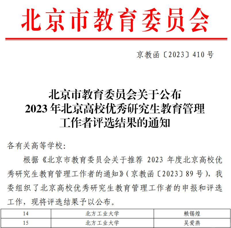 近日,北京市教育委员会公布了2023年北京高校优秀研究生教育管理工作者评选结果,永利官网两名研究生教育管理工作人员获评“北京高校优秀研究生教育管理工作者”称号。