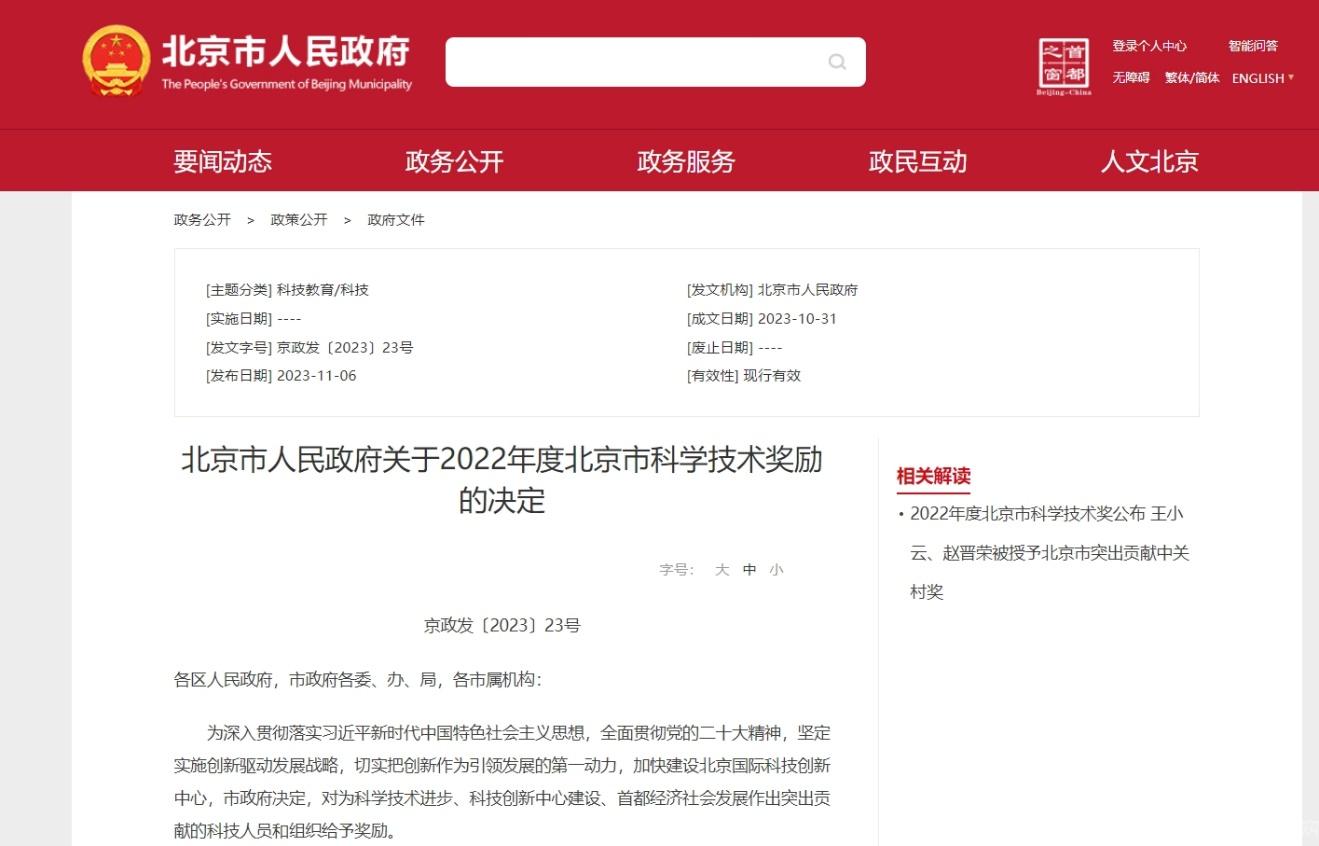 11月6日,北京市人民政府公布《关于2022年度北京市科学技术奖励的决定》,永利官网在此次评选中喜获4项奖励。