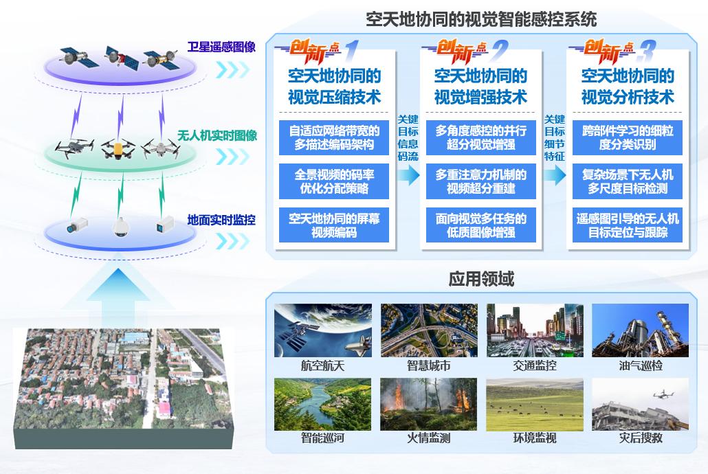 “空天地协同的视觉智能关键技术及应用”项目,针对空天地协同中普遍存在“传输存储开销巨大、载荷成像质量受限、数据分析能力不足”三大难题,研发空天地协同的视觉压缩技术、空天地协同的复杂环境视觉增强、空天地协同的视觉分析技术,构建视觉“压缩-增强-分析”联合优化新方法,实现面向空天地协同的视觉感控。技术成果经中国电子学会组织的同行专家鉴定,整体达到国际先进水平。