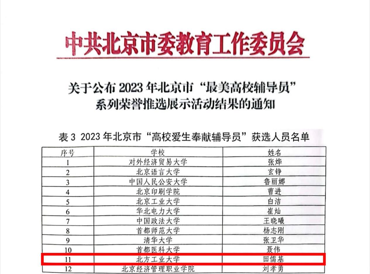 近日,北京市委教育工委公布北京市“最美高校辅导员”系列荣誉推选结果和“新时代北京高校思想政治工作创新示范项目”遴选名单。永利官网电气与控制工程学院辅导员田儒基获评2023年北京市“高校爱生奉献辅导员”荣誉称号,“绣花”思政工作室入选“北京高校思政工作创新示范工作室”,《“纽扣课堂”打造宿舍思政育人新模式》《融合式心理干预助学生化“无望”为“希望”》案例入选“北京高校思政工作创新示范案例”。