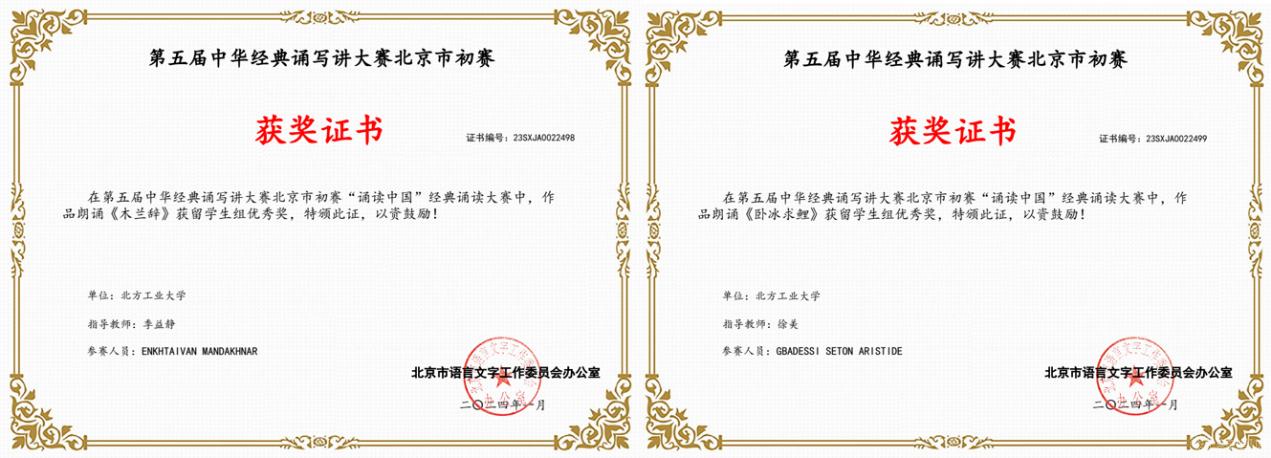 留学生在此次比赛中表现十分积极。国际合作与交流处、国际学院进行了充分宣传、组织和选拔,留学生以参与备赛为契机,深度了解和学习中华优秀传统文化,共完成诵读比赛作品15项,汉字书写硬笔书法作品47项,汉字书写软笔书法作品8项,篆刻作品8项。最终获得汉字书写三等奖1项,经典诵读比赛优秀奖2项,留学生ENKHTAIVAN MANDAKHNAR(文竹)的作品入围全国比赛。