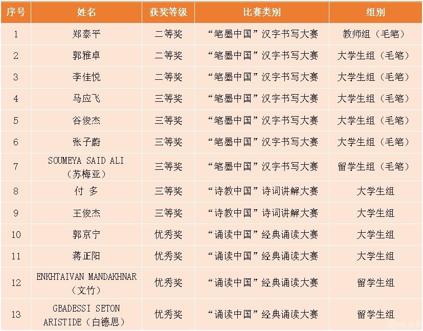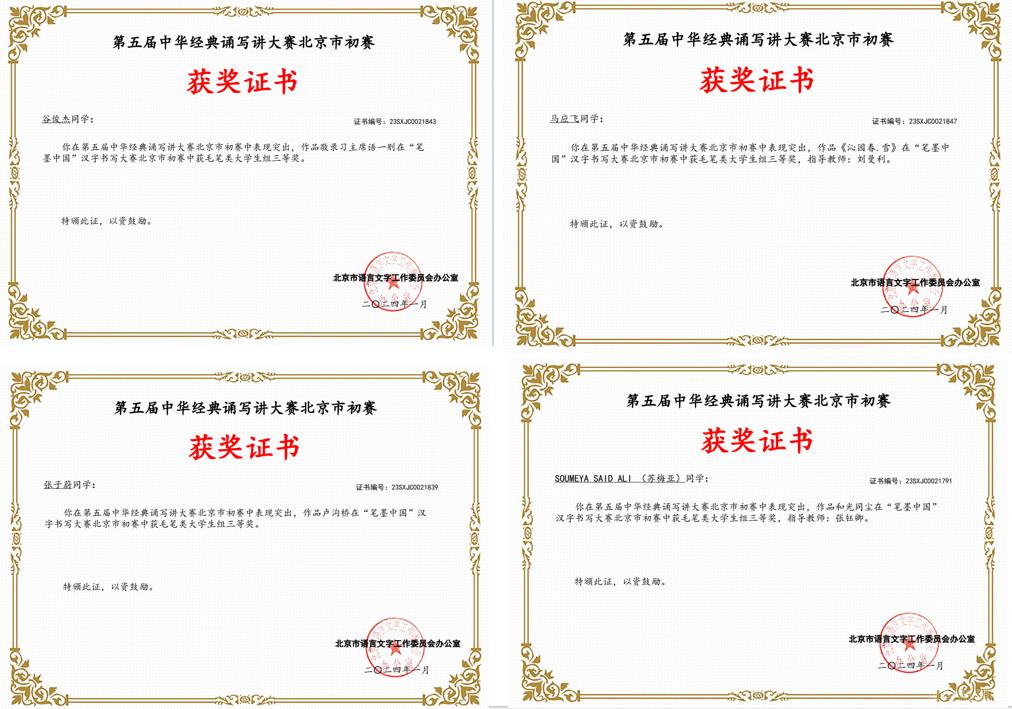 在“笔墨中国”汉字书写分赛中,师生充分展示在书法领域扎实的基本功,与全市近万名参赛者同台竞技,不但实现了学校在“笔墨中国”分赛中获奖“零”的突破,还集中发力,获得教师组二等奖1项,学生组二等奖2项、三等奖3项,留学生组三等奖1项。