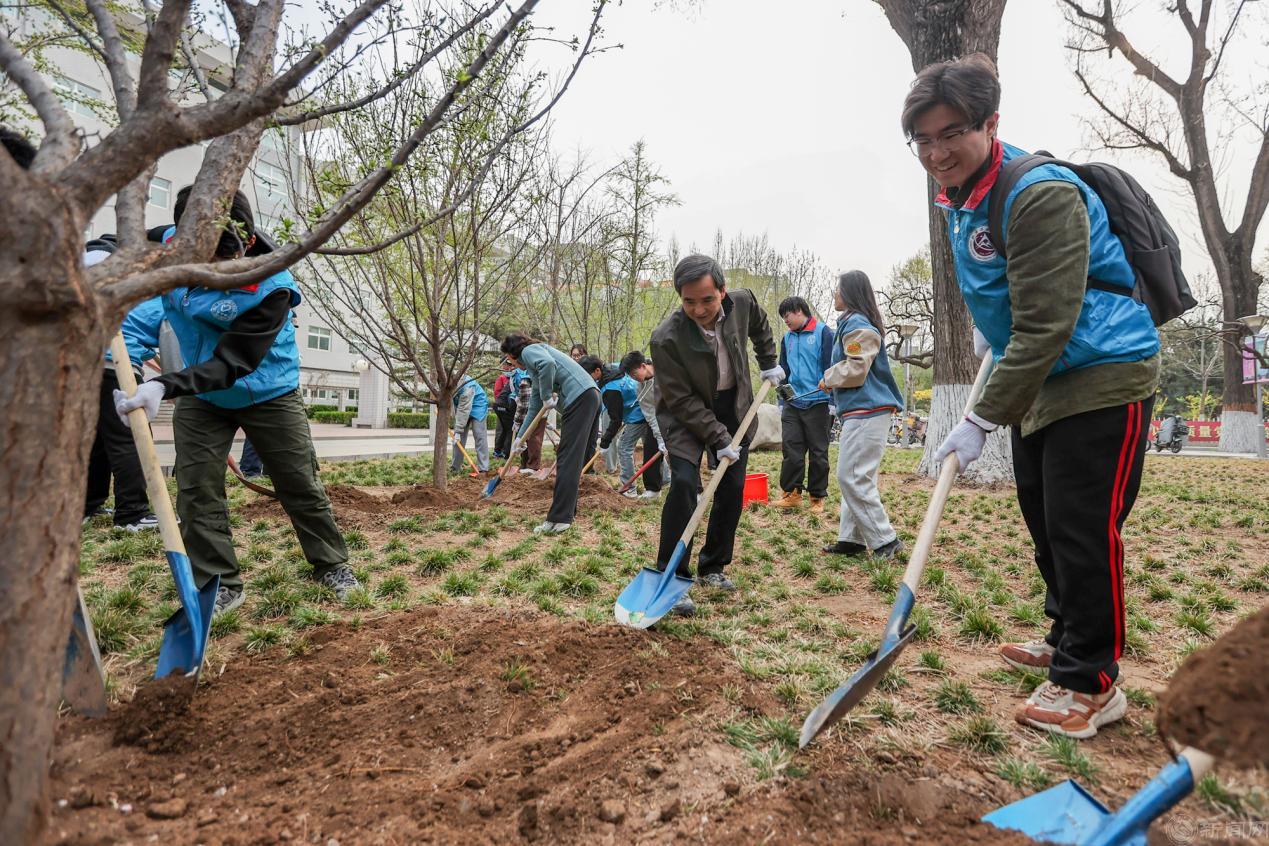 毓秀春来到,植树正当时。为推进绿色生态校园建设,拓展劳动育人载体,4月3日上午,在学校博智楼北侧植树点,校党委书记刘军带领全体在校校领导与学生志愿者一起参加校园义务植树活动,共建美丽工大。