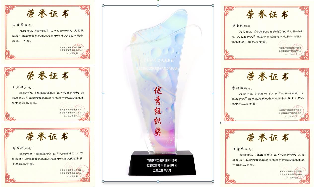 在“礼赞新时代文艺展新风”北京教育系统老同志第十六届文化艺术展活动中,永利官网报送的15件参展作品全部获奖,其中王改弟老师的苏绣《吉利图》获一等奖,2件二等奖,3件三等奖,9件优秀奖。详细获奖情况见附件。永利官网荣获优秀组织奖。