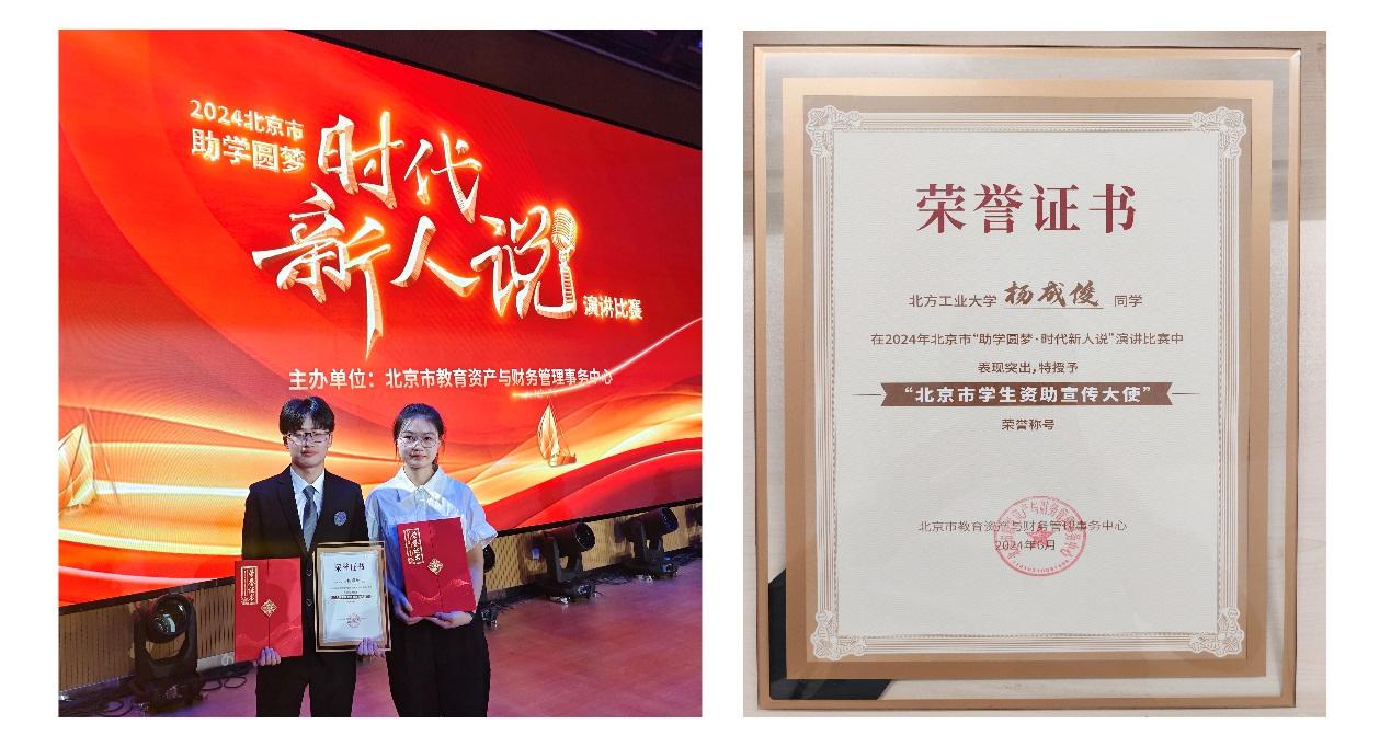 6月7日,在2024年北京市“助学圆梦·时代新人说”演讲比赛总决赛中,永利官网电气与控制工程学院杨成俊同学表现优异,获评2024年北京市“学生资助宣传大使”。同时,杨成俊同学与建筑与艺术学院彭祥敏同学入选“北京市学生资助宣讲团”。