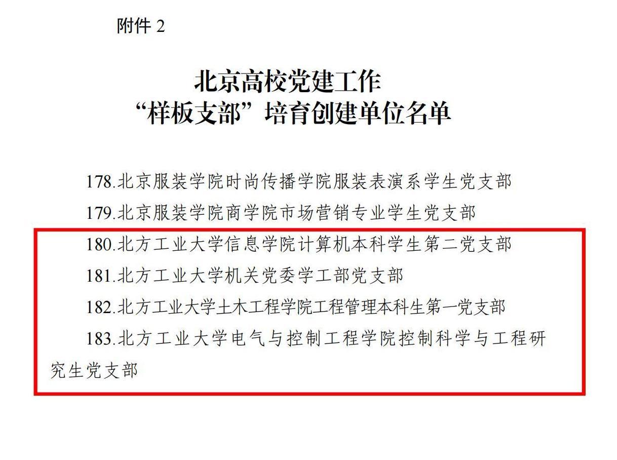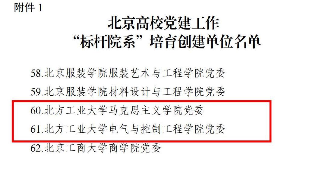 近日,北京市教育委员会公布了北京高校党建工作 “标杆院系”“样板支部”“党建引领实践创新示范项目”培育创建遴选结果,永利官网电气与控制工程学院党委、马克思主义学院党委入选北京高校党建工作“标杆院系”培育创建单位;信息学院计算机本科学生第二党支部、电气与控制工程学院控制科学与工程研究生党支部、土木工程学院工程管理本科生第一党支部、机关党委学工部党支部入选北京高校党建工作“样板支部”培育创建单位。