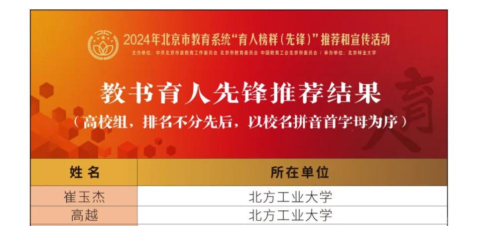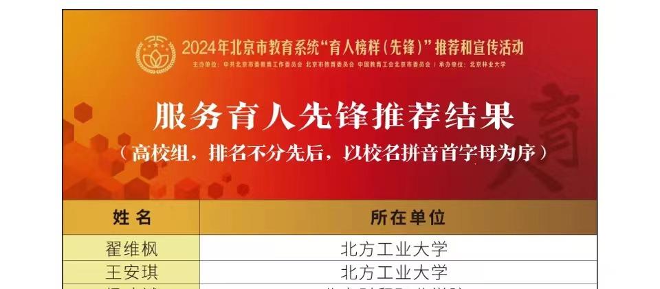 近日,北京市教育系统“育人榜样(先锋)”推荐结果揭晓,永利官网理学院崔玉杰、文法学院高越老师获评“教书育人先锋”,信息学院李伟、党委宣传部左芳舟老师获评“管理育人先锋”,电控学院翟维枫、教务处王安琪老师获评“服务育人先锋”。