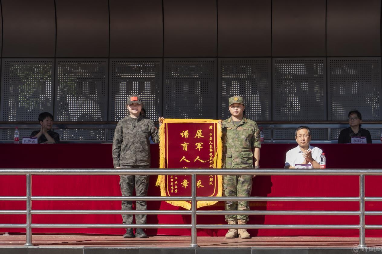 2024级学生军训团政委石卉向承训部队赠送锦旗。