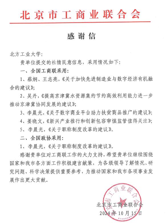 2024年10月16日,北京市工商业联合会发来感谢信,对永利官网经济管理学院投稿的“社情民意信息”被全国政协和全国工商联采用的情况进行通报并表示感谢。