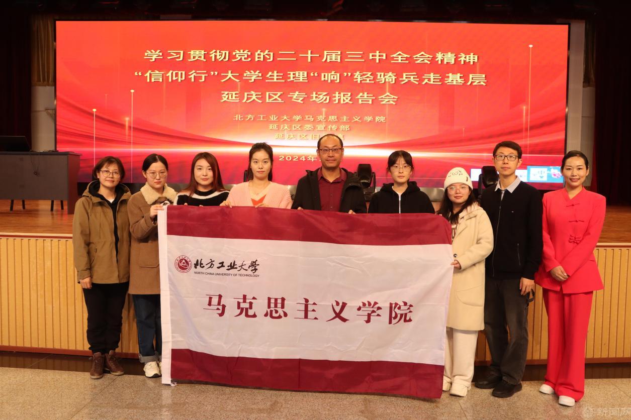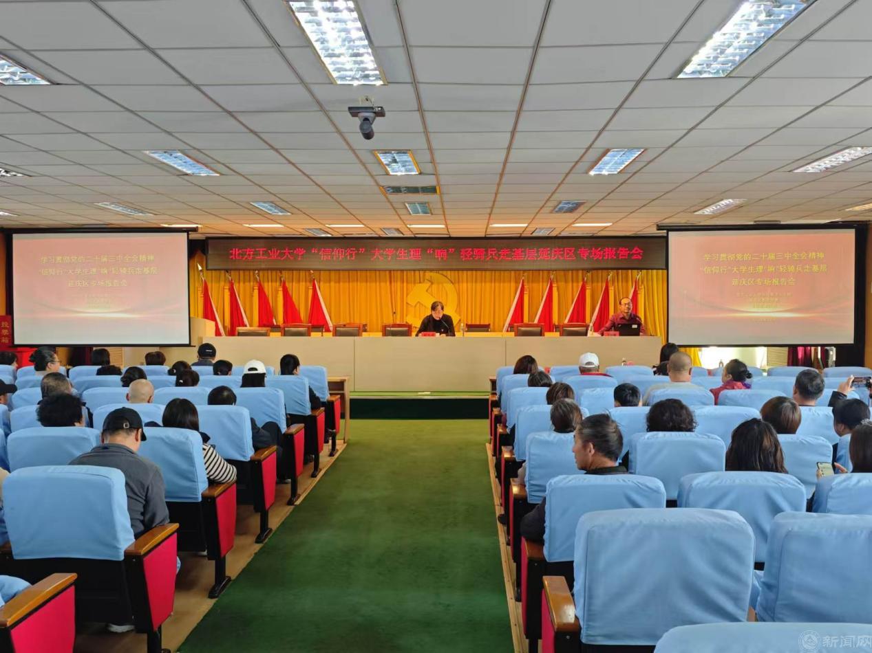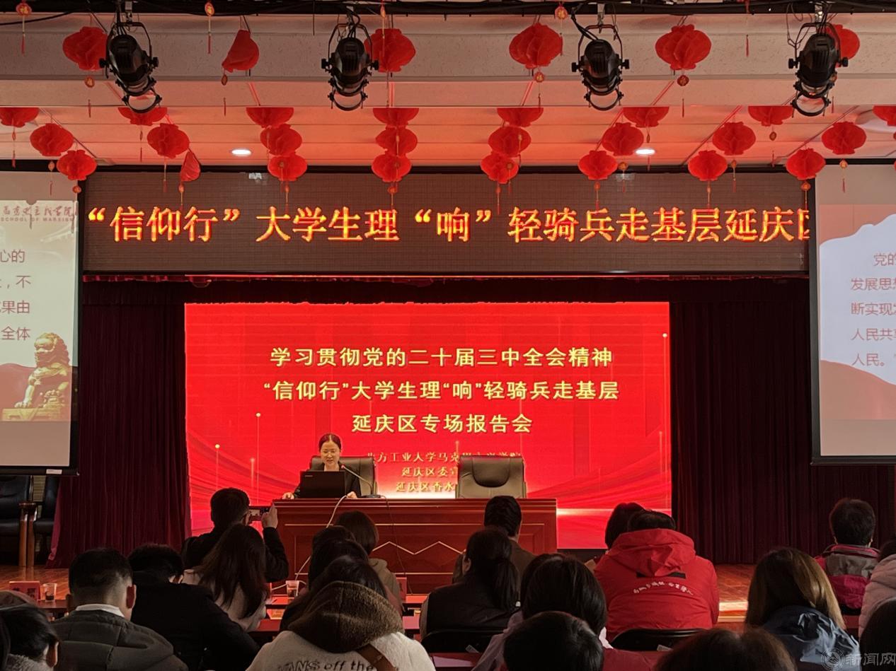 为进一步凝聚思想共识、筑牢理论根基,推动党的二十届三中全会精神紧贴实际、深入人心,10月24日,马克思主义学院师生宣讲团一行赴延庆区,开展“信仰行”大学生理“响”轻骑兵走基层活动。师生们分别来到延庆镇、旧县镇和香水园街道,开展党的二十届三中全会精神专题宣讲。二百余名党员代表、群众代表参加报告会。宣讲活动受到当地党员群众的普遍好评。
