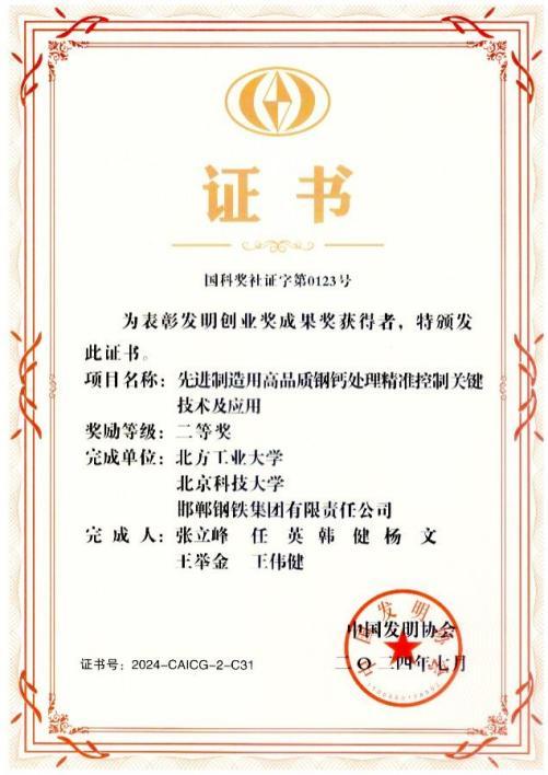 “先进制造用高品质钢钙处理精准控制关键技术及应用项目”针对钢液钙处理工业实践过程存在的喂钙量经验化、钙合金收得率波动大、夹杂物改性效果不稳定、大颗粒夹杂物来源不明确的行业难题,首次开发了先进制造用特殊钢的钙处理精准控制基础理论与关键技术,发明了先进制造用特殊钢的钙处理精准控制关键技术,有效提升了钙处理的精准性和稳定性,为我国先进制造用特殊钢产品质量的稳定提升和自主生产提供了保证。