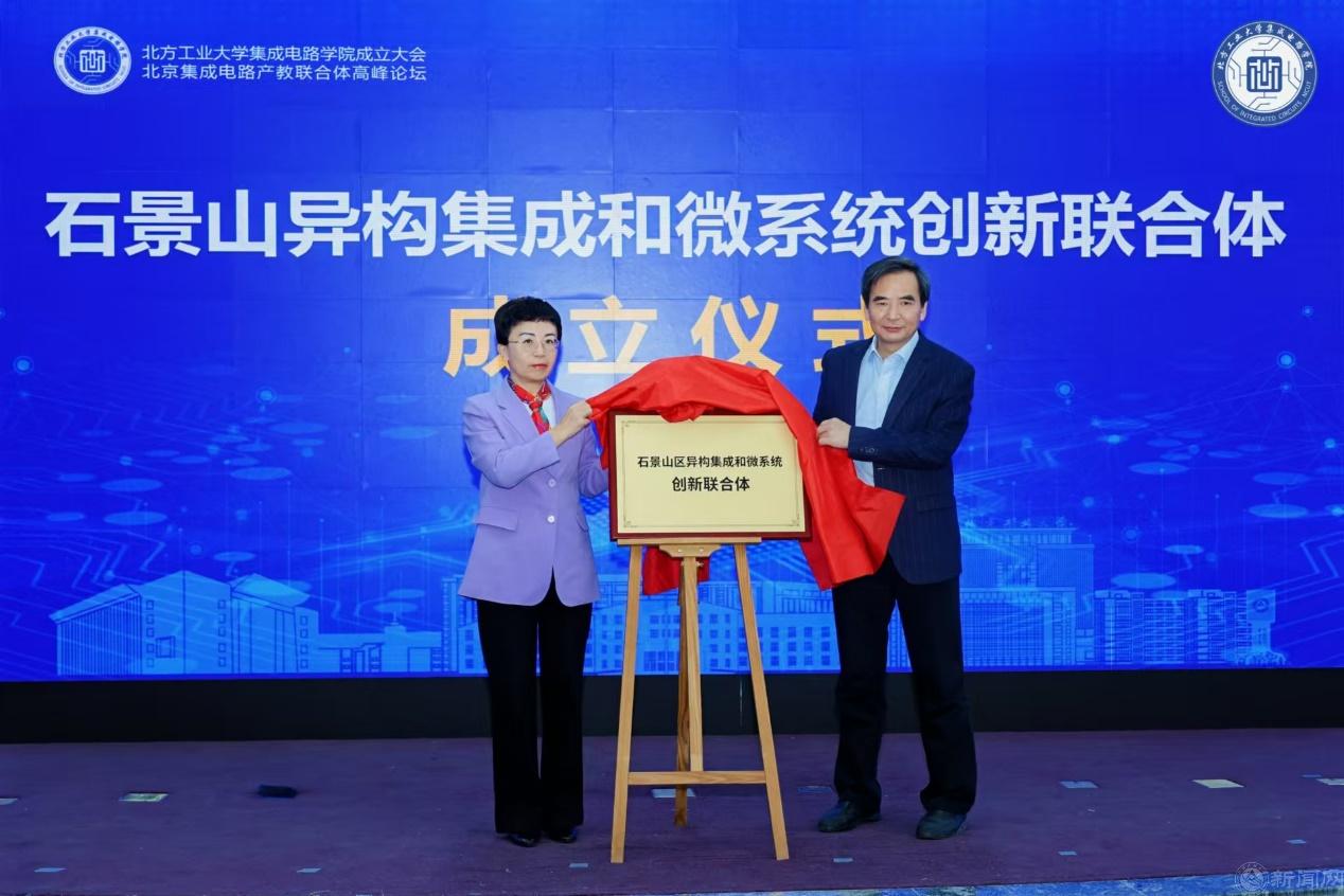 304永利集团官网入口党委常委、副校长王建稳与石景山区副区长李文化共同为“石景山异构集成和微系统创新联合体”揭牌。