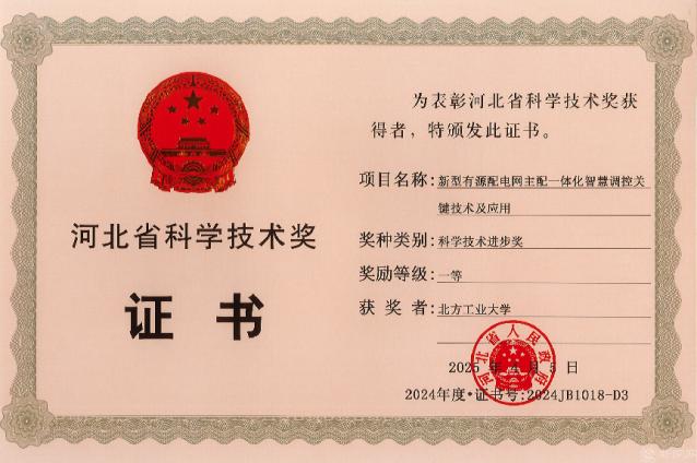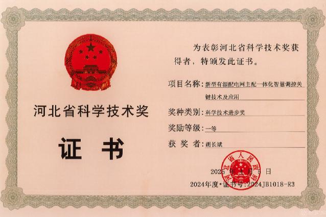 近日,河北省人民政府公布了2024年度河北省科学技术奖获奖名单,永利官网电气与控制工程学院胡长斌教授参与的“新型有源配电网主配一体化智慧调控关键技术及应用”获评河北省科学技术进步奖一等奖。
