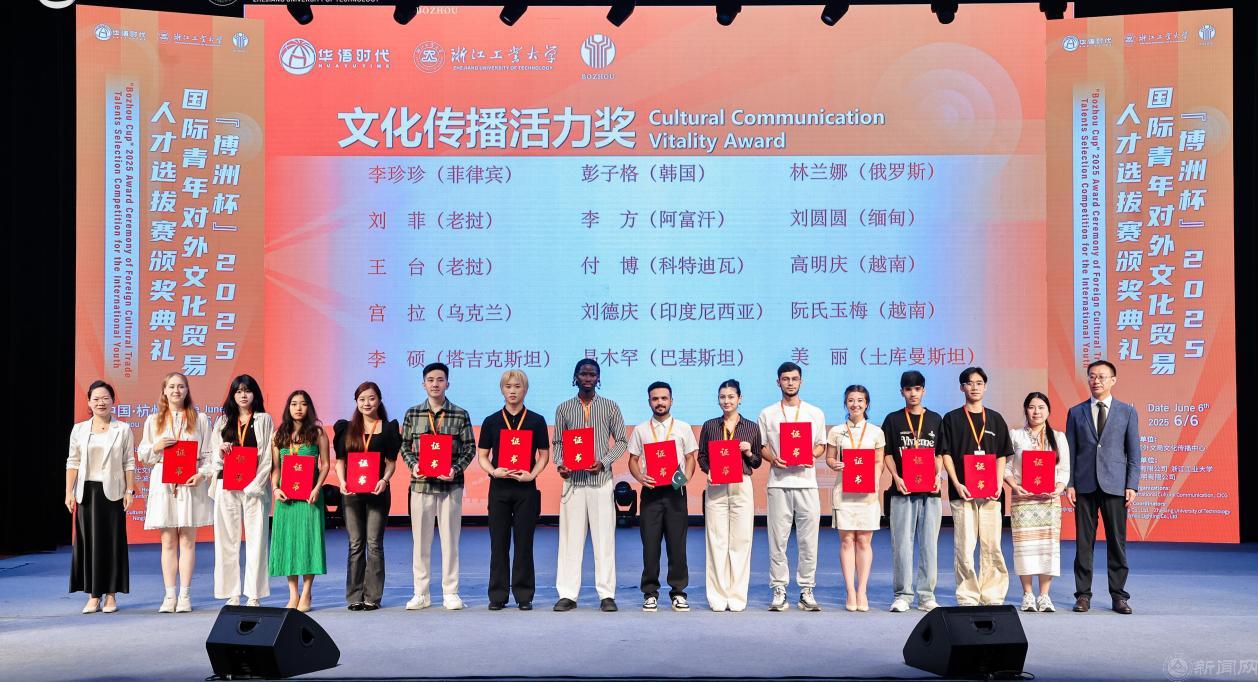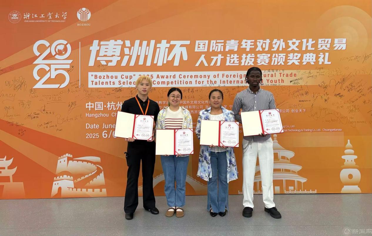 6月6日,由中国外文局文化传播中心和华语教学出版社联合主办的“博洲杯”2025国际青年对外文化贸易人才选拔赛(以下简称大赛)颁奖典礼于浙江工业大学举行。永利官网在本次人才选拔赛中取得佳绩,其中刘德庆(印度尼西亚)和付博(科特迪瓦)同学获得文化传播活力奖,德岛明日香(日本)、卡马拉(冈比亚)、徐银禧(韩国)、哈三(尼日利亚)等同学获得文化互鉴友好奖。国际学院刘妍、吴维、季益静、刘丽萍等教师获得优秀指导教师奖,永利官网同时获评院校优秀组织奖。