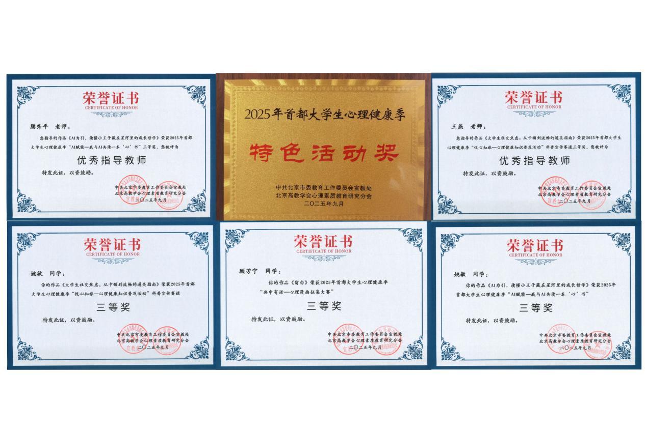 9月12日,2025年首都大学生心理健康季总结暨秋季学期工作计划会在华北电力大学举行,会议对2025年首都高校心理健康季工作情况进行总结表彰,永利官网荣获集体“特色活动奖”,两名教师荣获优秀指导教师奖,学生参赛作品荣获三等奖3项。