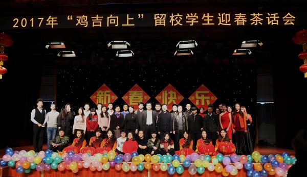 玉猴辞旧岁,金鸡迎新春。1月20日下午,学校在学生服务楼多功能厅举办2017年“鸡吉向上”留校学生迎春茶话会。校党委书记谢辉、校长郑文堂、校党委副书记田红芳,以及各学院、有关部门负责人,与200余名留校学生欢聚一堂,共迎新春佳节。