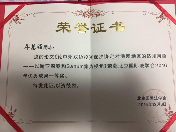 永利官网文法学院法律系乔慧娟副教授提交的论文“论中外双边投资保护协定对港澳地区的适用—以谢亚深案和Sanum案为视角”喜获2016年北京国际法学会优秀成果一等奖,并作为获奖代表接受外交部条法司徐宏司长颁奖。