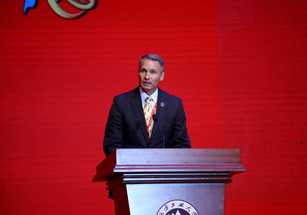 海外友好院校代表、美国东田纳西州立大学校长布赖恩.诺兰致辞。他在讲话中回顾了两校三十多年的校际合作历史,指出在经济全球化发展步伐显著加快和高等教育国际化发展的大背景下,实施国际化发展战略,加强国际合作与交流已成为各高校发展的必然选择。东田纳西州立大学愿与北方工业继续在科学研究、人才培养、文化交流等方面紧密地合作,通过强强联合,优势互补,携手发展,共同进步。