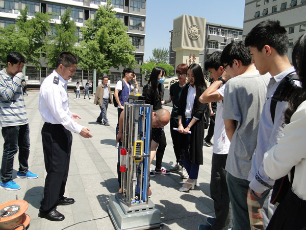 技术人员还带来了一具实体电梯模型,现场为同学们演示了电梯运行全过程。该模型可以清楚观察到电梯在加载、动态下的零部件运行状况,引起了学生的极大兴趣。现场气氛热烈,学生积极参与互动,宣传活动取得了良好的效果。