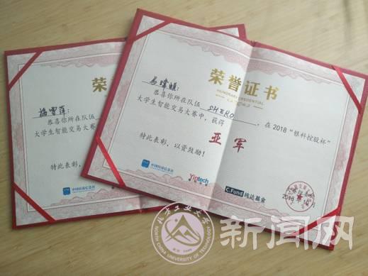 10月20日,首届“银科控股杯”全国大学生智能交易大赛圆满结束。由永利官网经管学院经济系金融16-2班马暐頔(队长)、泉州师范学院梅雪萍(队员)组成的SHERO代表队,在永利官网张蜀林老师的指导下,获得亚军,并获取大赛奖金5万元人民币及20%的实盘收益分成(实盘本金50万人民币)。